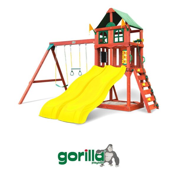 Enhance your backyard with the Gorilla Playmaker Deluxe Swing Set! This premium playset delivers exceptional play value with its thoughtful design and quality construction. Featuring a spacious play deck, thrilling slide, and multiple swing options, it provides endless entertainment for active children. The durable cedar construction ensures years of outdoor adventures while the attractive design complements your home’s exterior.